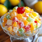A colorful and nostalgic dessert featuring a delightful blend of fruits and fluffy whipped toppings, perfect for gatherings.