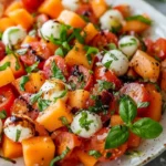 Creating this delightful salad is straightforward. Start by arranging the cubed cantaloupe, heirloom tomato chunks, and torn mozzarella pieces elegantly on a large platter. This assortment of colors and textures should inspire anticipation of the flavors to come. Drizzle generously with balsamic glaze and a hint of extra virgin olive oil to tie it all together. Next, sprinkle the minced basil over the top, letting its aroma infuse the layers of ingredients. Season the dish with freshly ground black pepper and a pinch of finishing salt to accentuate the natural flavors. For the best experience, chill the salad until you’re ready to serve, allowing the flavors to meld beautifully.