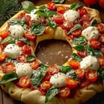 A festive centerpiece pizza that combines vibrant flavors in a wreath shape, perfect for holiday gatherings.