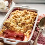 Combine and Bake: Spread the crumble topping over the rhubarb mixture, ensuring all is covered. Place the dish in the preheated oven and bake for 35 to 45 minutes, or until the filling is bubbly and the topping is a lovely golden brown.