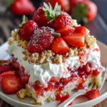 A delightful and vibrant dessert capturing the spirit of summer with a moist strawberry-infused cake, creamy toppings, and a crunchy crumble.