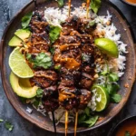 - Serve: Arrange skewers over rice or coconut rice. Garnish with lime wedges, avocado slices, sesame seeds, and cilantro. Serve peanut sauce on the side.